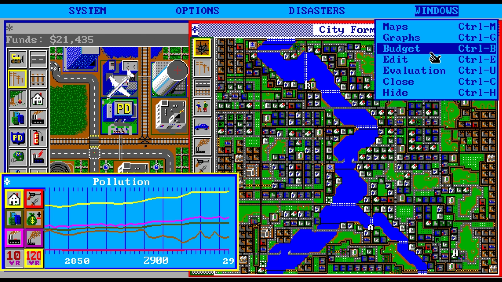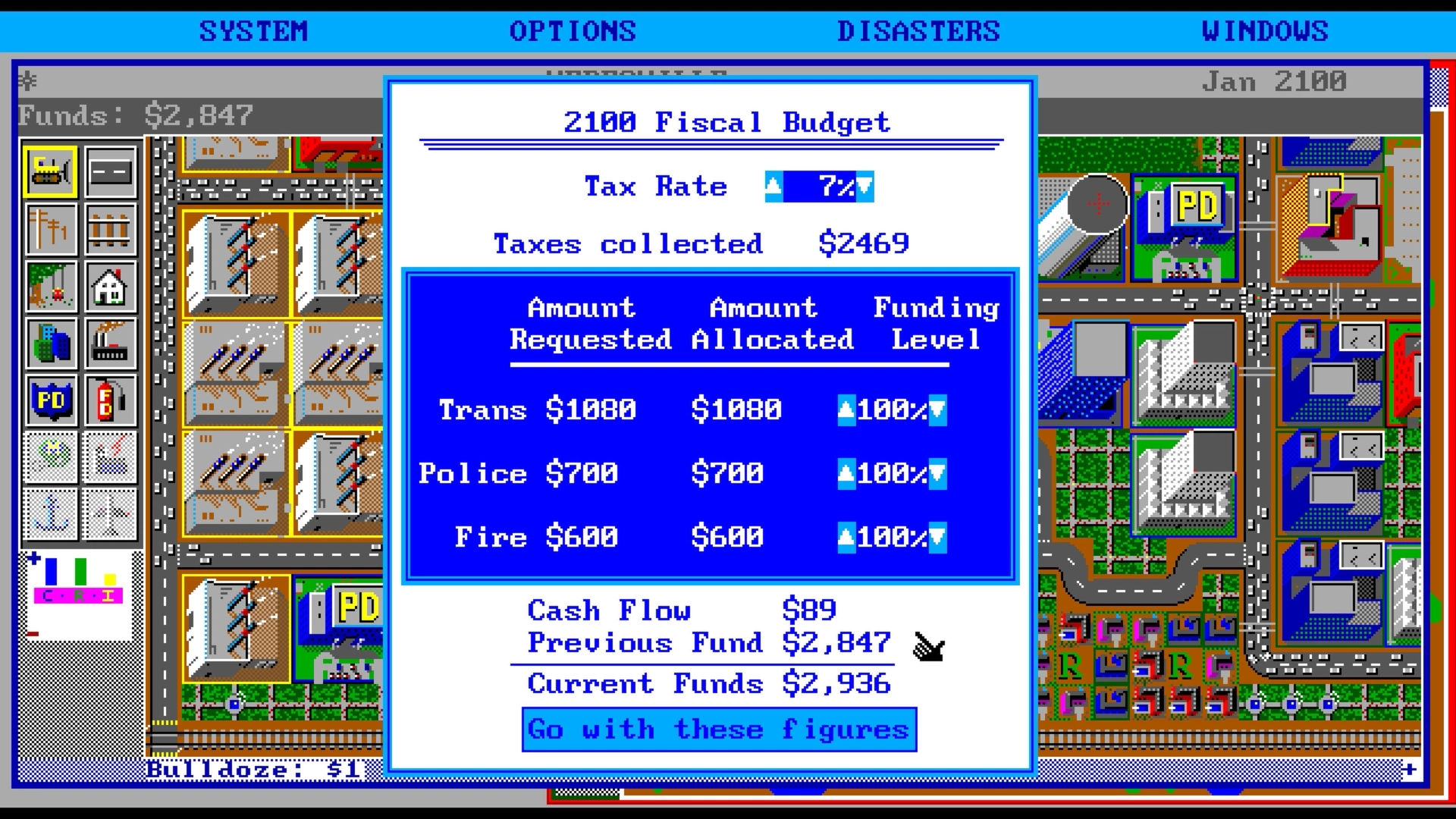 Dalla finestra del budget, il giocatore può gestire l’aspetto finanziario, impostando un’aliquota fiscale uniforme per le zone RCI, influenzando entrate, felicità dei cittadini e densità urbana. Da qui si decide anche la quota di risorse da destinare ai principali servizi pubblici, come trasporti, polizia e vigili del fuoco, bilanciando costi ed efficacia. La schermata consente inoltre di monitorare entrate, uscite e il flusso di denaro previsto per l’anno successivo, calcolato all’inizio di ogni nuovo anno. Compare automaticamente a inizio anno mettendo in pausa la simulazione, funzione disattivabile.