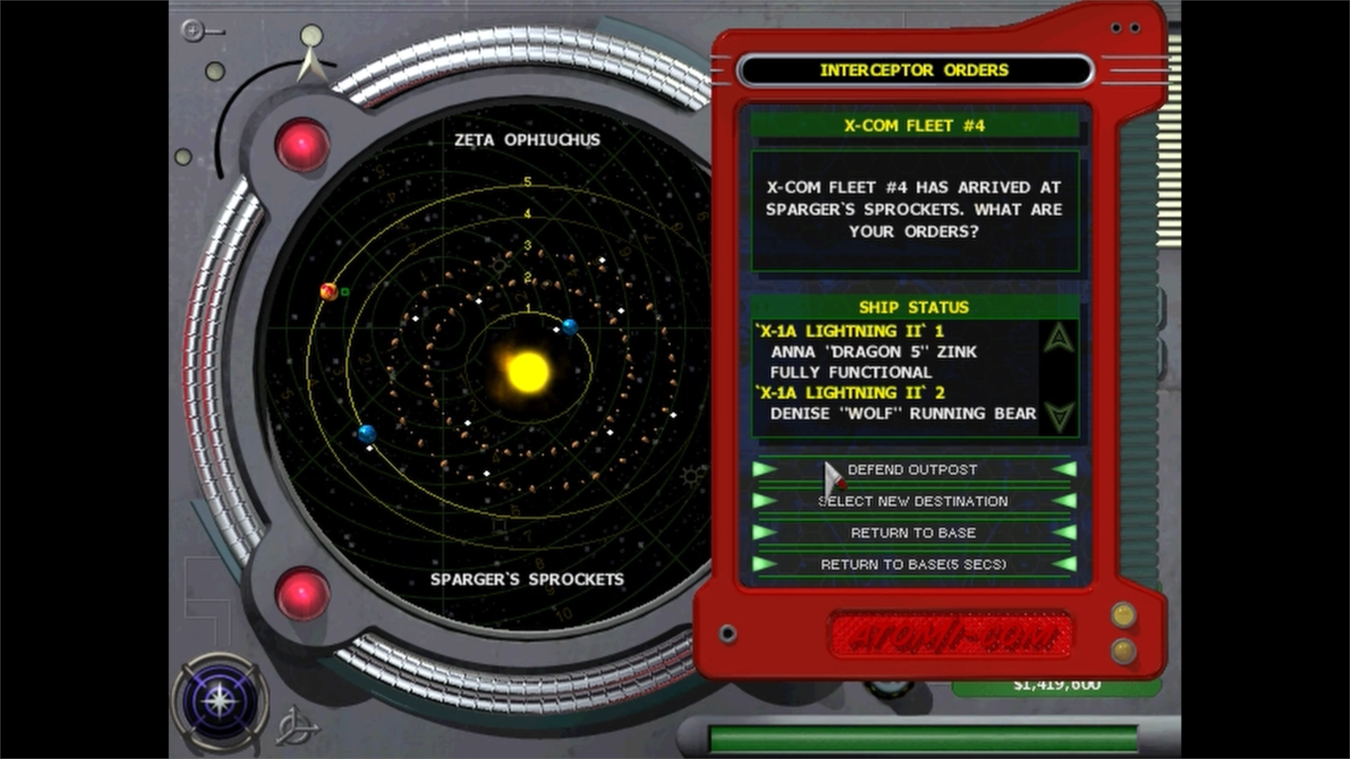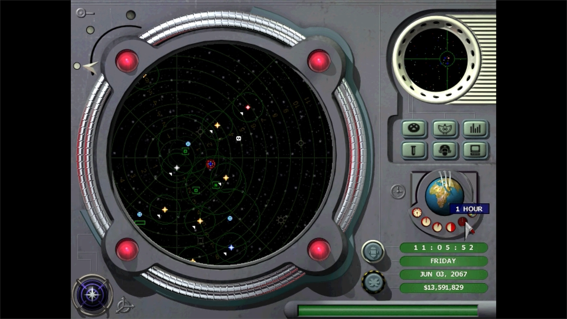 Sulla destra sono presenti i comandi e i menù principali. Sopra una barra dei messaggi che fornisce aggiornamenti in tempo reale, si trovano i controlli temporali, assieme a ora e data, bilancio attuale, e i pulsanti per inviare squadroni e sonde. Poco più in alto, sono presenti sei ulteriori pulsanti che permettono di accedere alle basi, all’equipaggiamento delle navi, ai rapporti, alla ricerca, agli acquisti e all’enciclopedia. Un tutorial dettagliato accompagna il primo accesso a questa interfaccia.