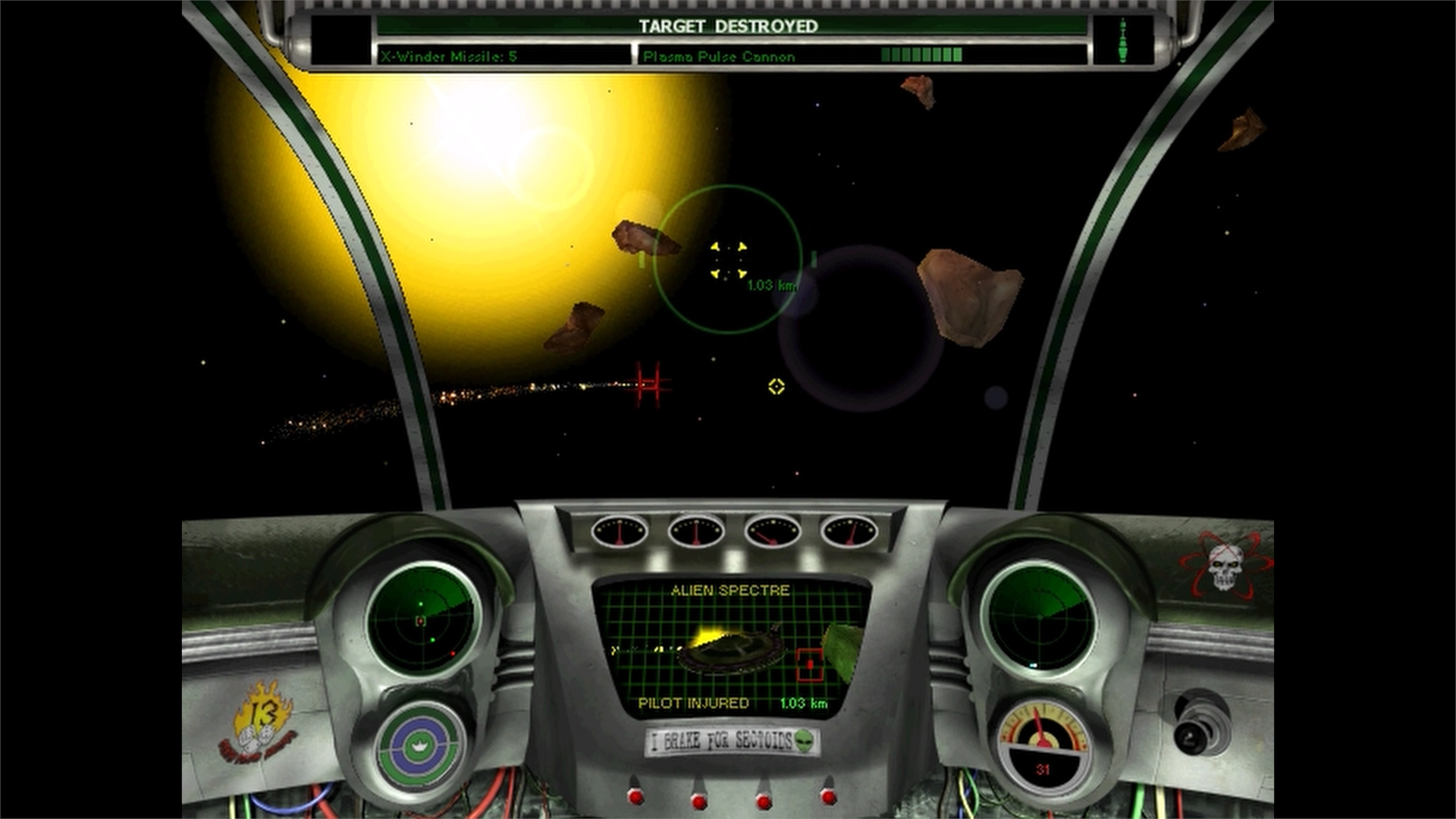 Il combattimento avviene in visuale da cockpit, con un HUD ricco di informazioni. In alto sono visualizzate le armi attualmente attive. In basso si trovano gli indicatori di velocità, due radar tridimensionali, lo stato di armatura e scudo, i livelli energetici e, al centro, le statistiche e la distanza del bersaglio inquadrato. La nave nemica sarà evidenziata da un riquadro rosso, con un reticolo che indica dove mirare per colpirla, calcolato dinamicamente in base a velocità e traiettoria di entrambi.